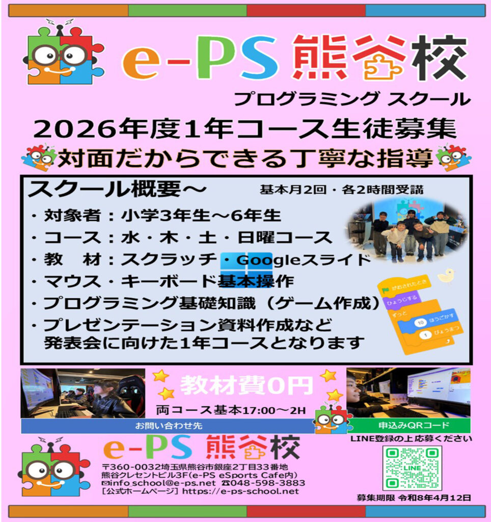 2026年度プログラミング1年コース日程追加のお知らせ。